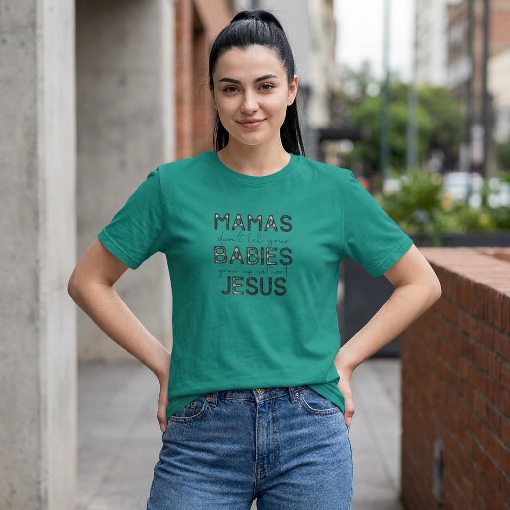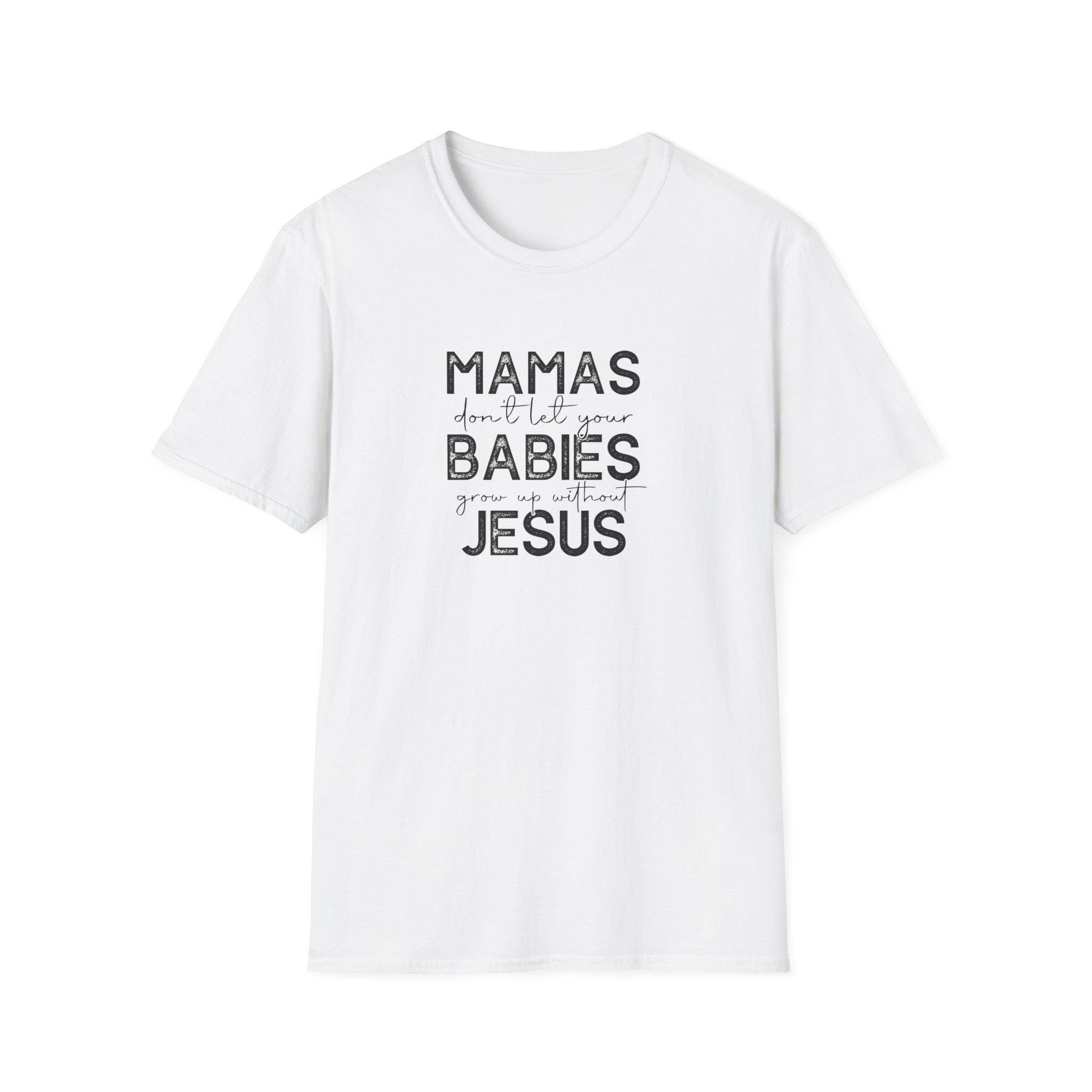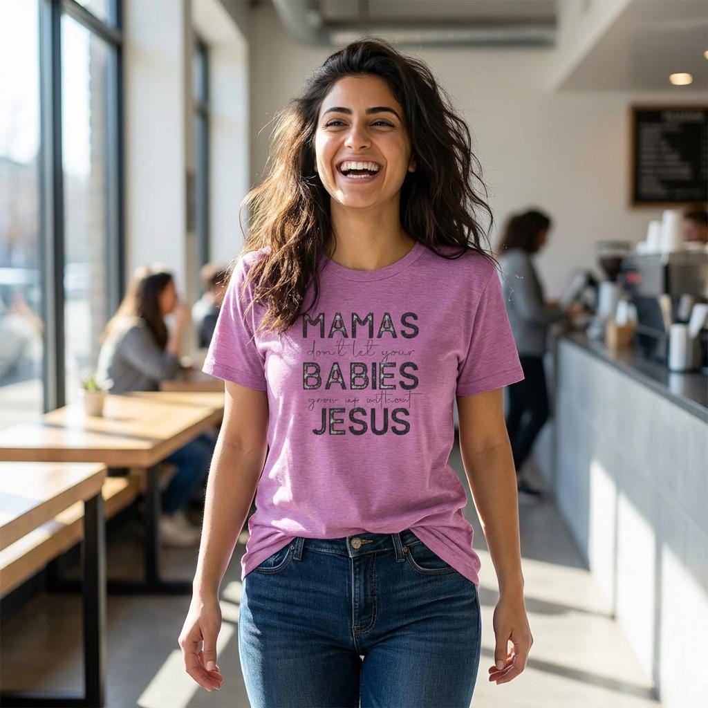 Lightweight, breathable, and softly worn — this classic crew tee carries a quiet message that speaks like a warm conversation. The distressed lettering reads like a handwritten note: MAMAS don’t let your BABIES meet JESUS. It’s a homey, faith-forward design that sits comfortably in everyday life: school runs, coffee dates, nursery pickups, or church socials. The soft ring-spun cotton drapes easily and the clean white backdrop makes the faded black text feel vintage and familiar. It layers under cardigans or stands alone with jeans. For the mama who wants faith and humor stitched into her daily rhythm, this shirt slides into the wardrobe like an old friend and keeps its shape through wash after wash.