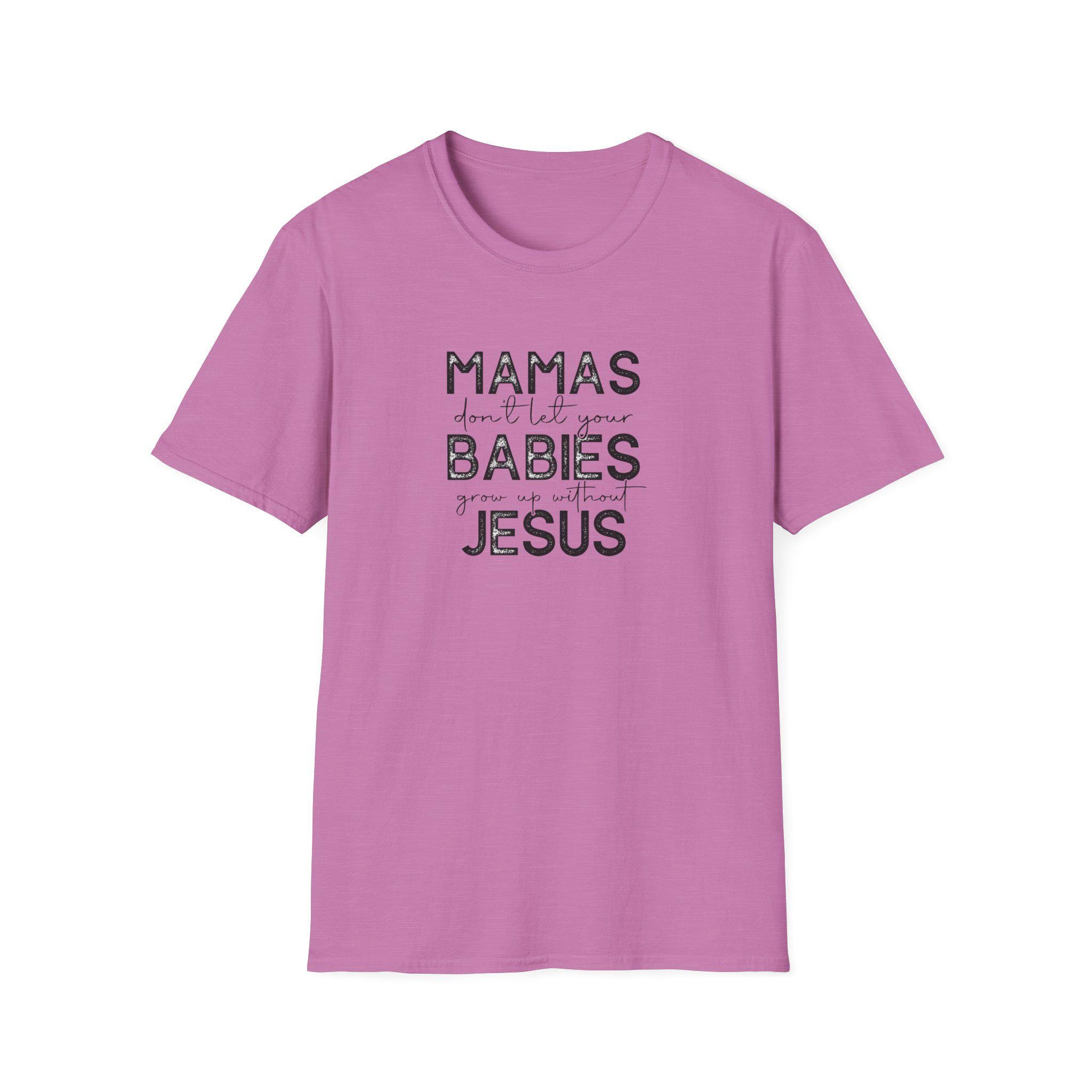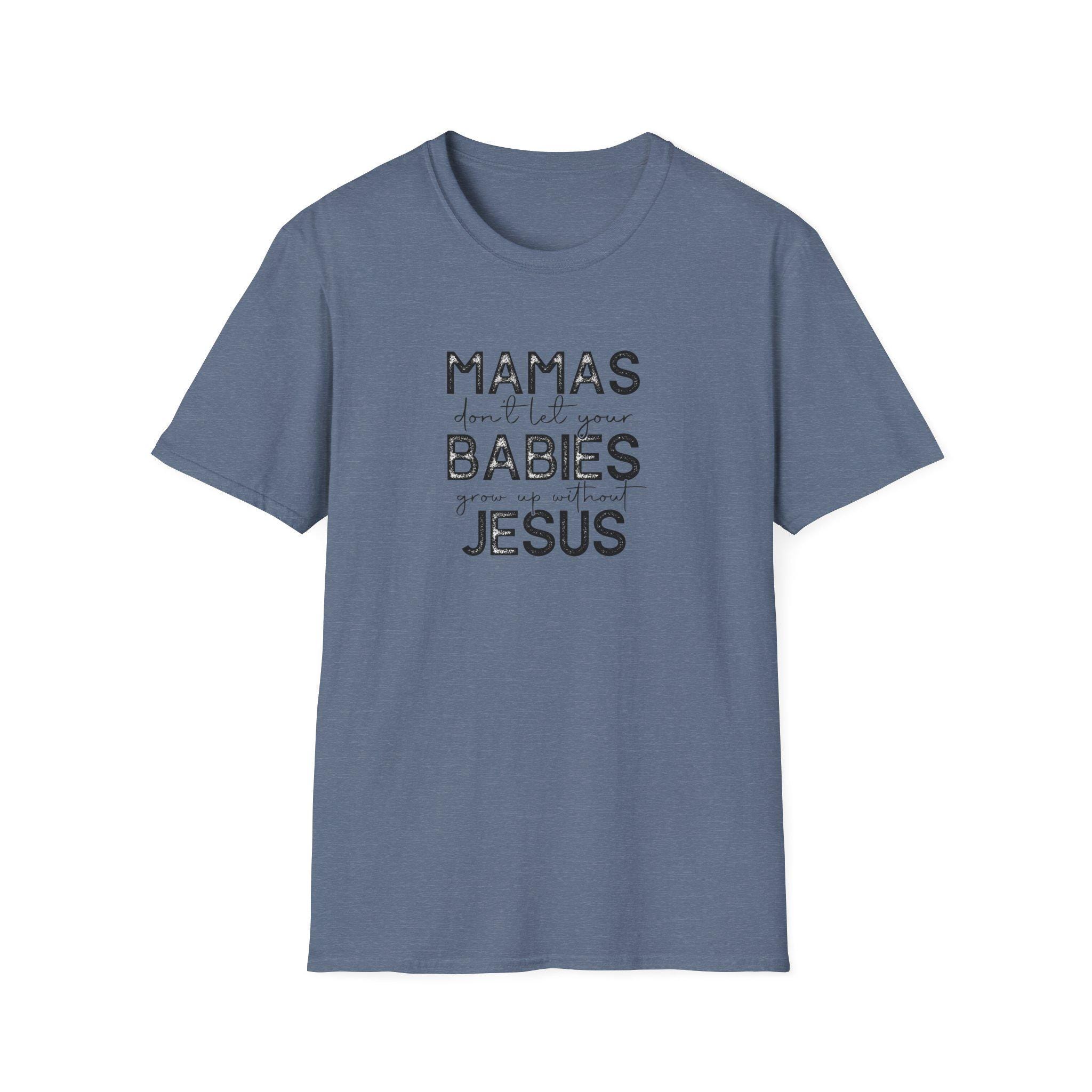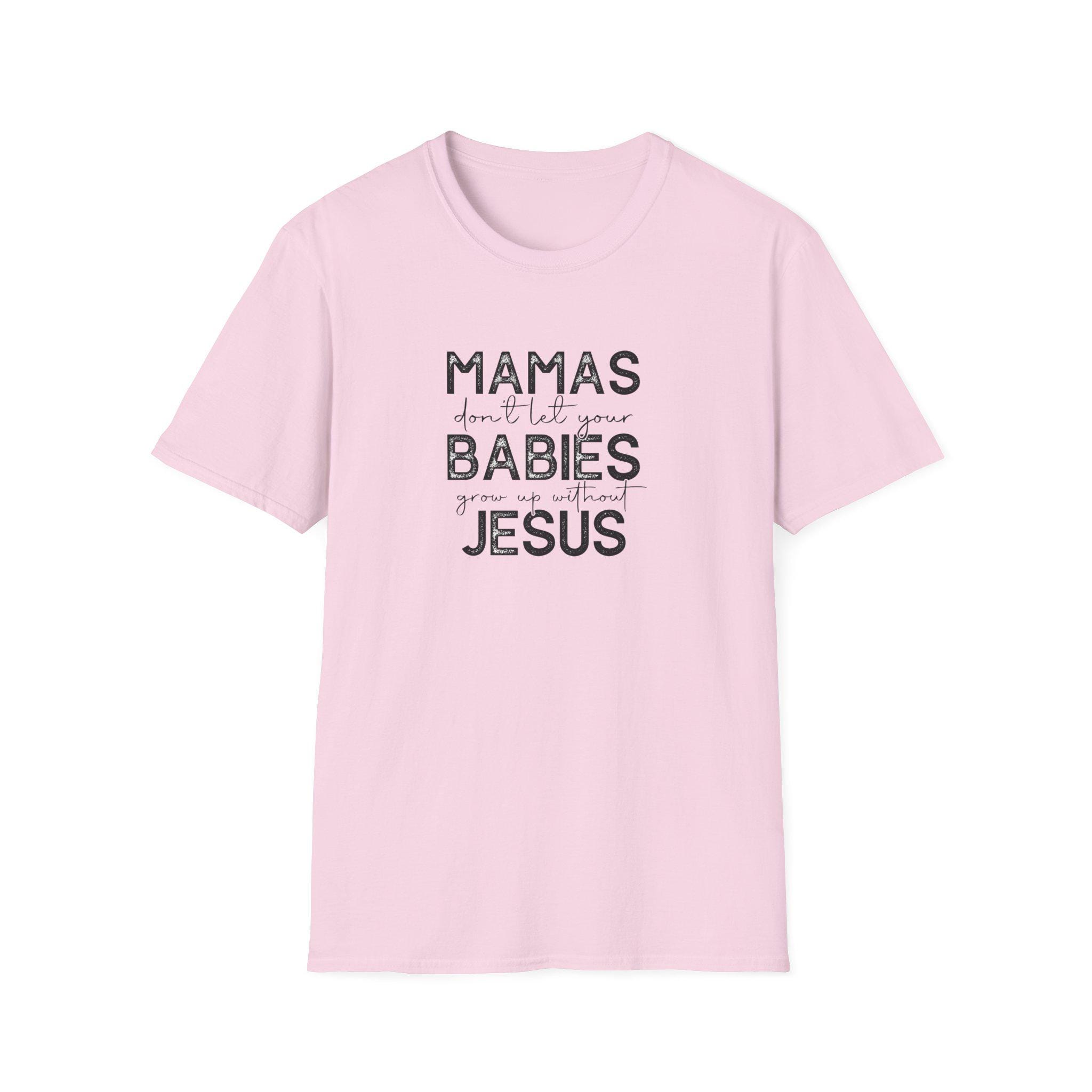Lightweight, breathable, and softly worn — this classic crew tee carries a quiet message that speaks like a warm conversation. The distressed lettering reads like a handwritten note: MAMAS don’t let your BABIES meet JESUS. It’s a homey, faith-forward design that sits comfortably in everyday life: school runs, coffee dates, nursery pickups, or church socials. The soft ring-spun cotton drapes easily and the clean white backdrop makes the faded black text feel vintage and familiar. It layers under cardigans or stands alone with jeans. For the mama who wants faith and humor stitched into her daily rhythm, this shirt slides into the wardrobe like an old friend and keeps its shape through wash after wash.